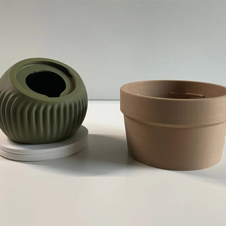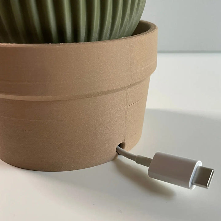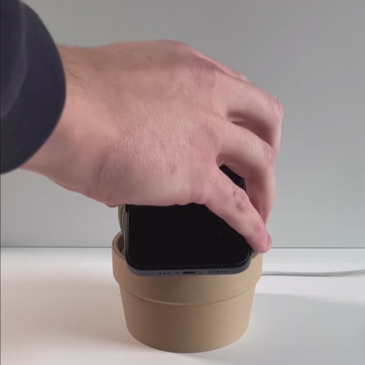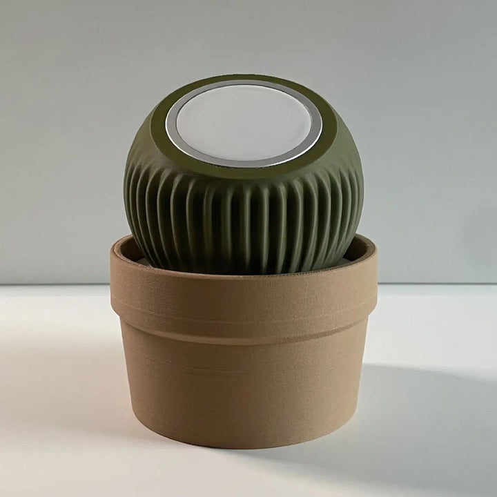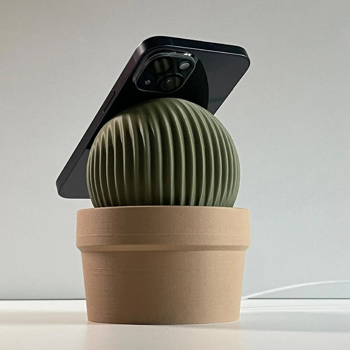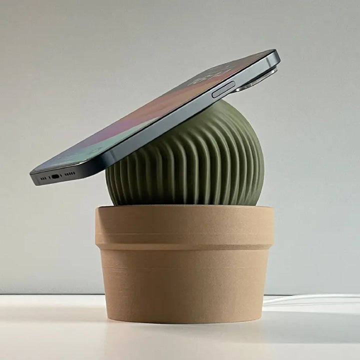 A 3D-printed holder for Apple MagSafe charger shaped like a green cactus in a terracotta pot, providing a playful and functional charging base. The color options are only available for the cactus plant. The pot is 3D-printed in a caramel terracotta color.