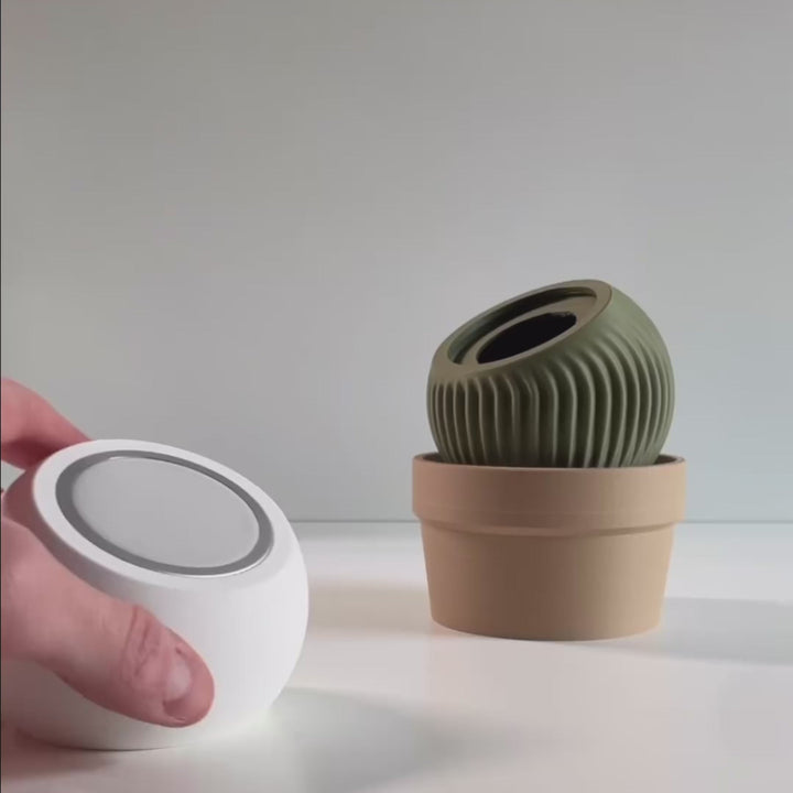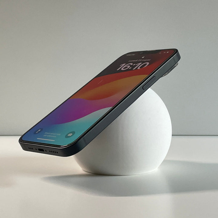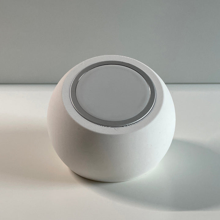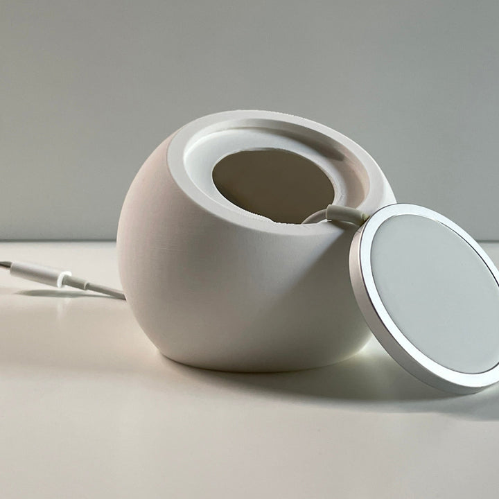 Magsafe charging station sphere for Apple products. This spherical charging station is used to integrate the MagSafe charger and Apple's charging cable. The sphere is 3D printed from sustainable plastic (PLA).