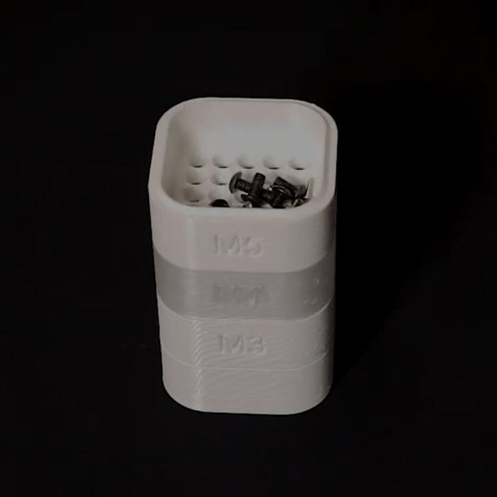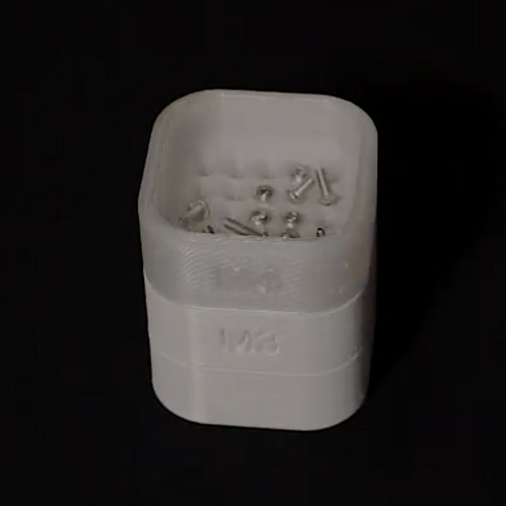 A quick little sorting and storage unit for metric bolts and screws. Just stack the sieve trays from smallest to largest (M2 - M5), pour your mixed collection of screws and bolts into the top tray, put the lid on, and shake it well from side to side. And that's it! Designed by BubsBuilds